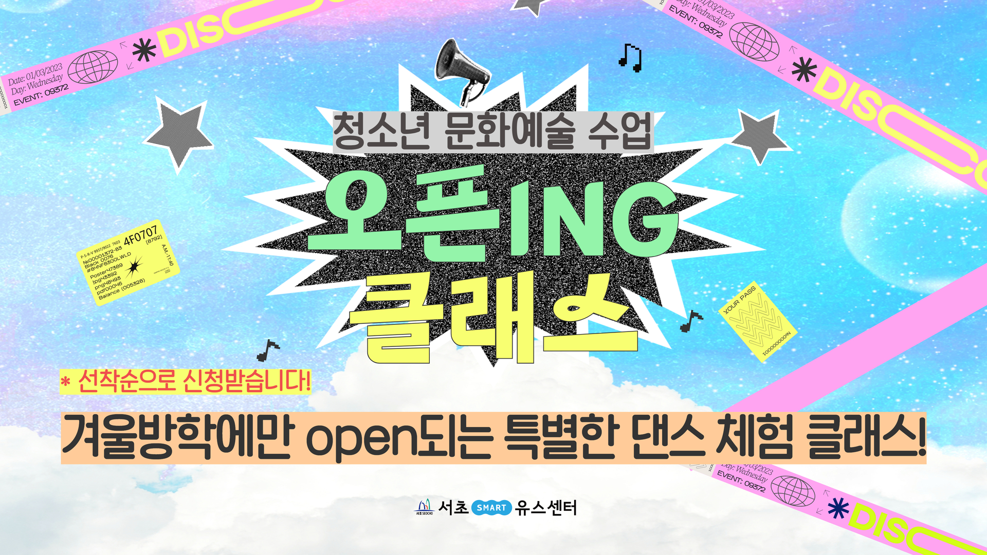 - 겨울방학에만 OPEN되는 원데이 특별한 댄스 체험 클래스! - 댄스 체험을 통해 만나는 케이팝 인기곡! - 처음이어도 OK! 전문 강사 선생님과 즐겁고 쉽게 배울 수 있어요.