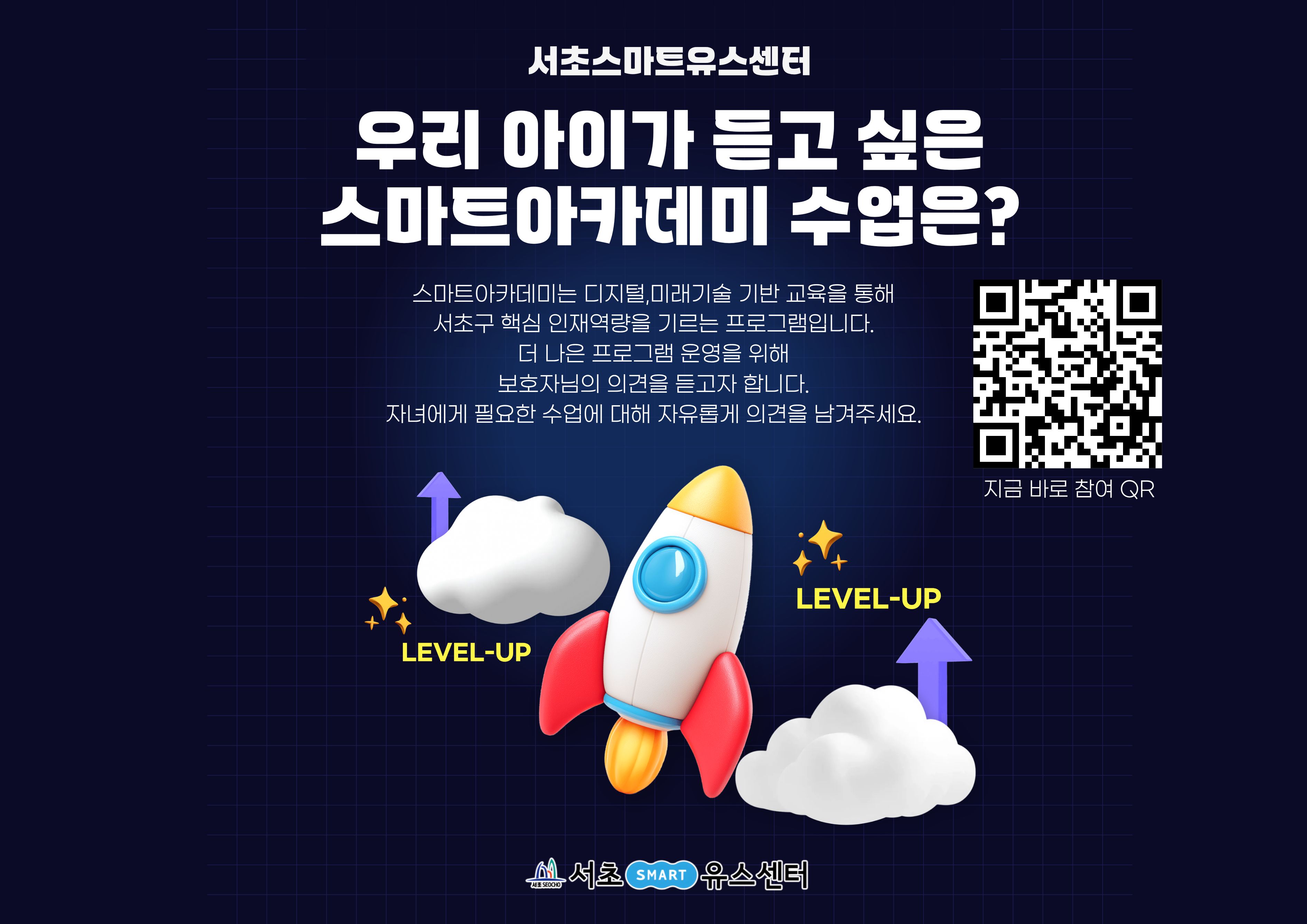 스마트아카데미는 디지털,미래기술 기반 교육을 통해 서초구 핵심 인재역량을 기르는 프로그램입니다. 더 나은 프로그램 운영을 위해 보호자님의 의견을 듣고자 합니다. 자녀에게 필요한 수업에 대해 자유롭게 의견을 남겨주세요.