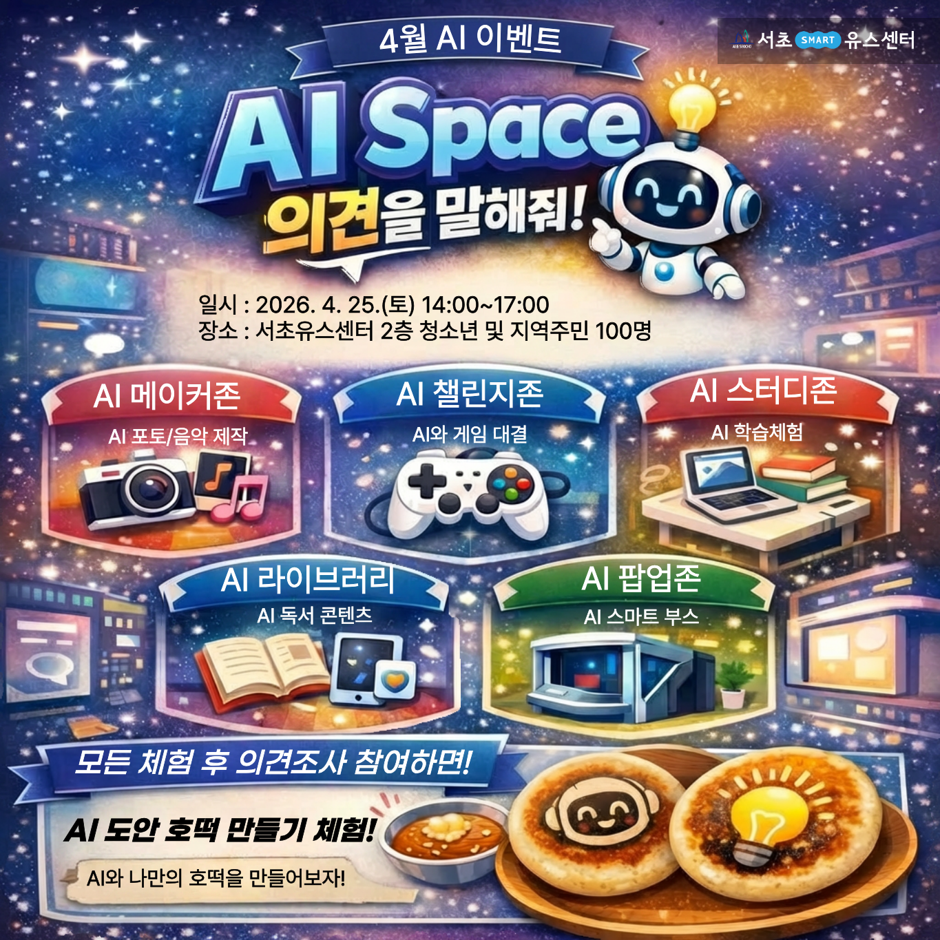 2층 AI Space 공간을 체험하고 여러분의 의견을 남겨주세요~ 의견을 남겨주신 분들에게 호떡 만들기 체험을 제공합니다!