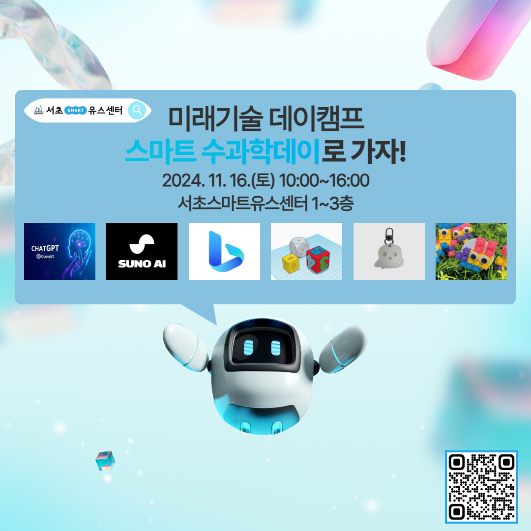 AI를 주제로 체험부스 및 특강 진행 [체험부스] 1. AI로 나만의 주제곡 만들기 2. 나만의 애니메이션 만들기 3. 데이터 스마트톡 만들기 4. AI로 알아보는 미래직업 탐구생활 등 [특강] 주제: 생성형 AI와 3D모델링에 대해 알아보자! 내용: 생성형 AI 및 3D모델링 프로그램에 익숙해지기 / 프로그램들을 활용하여 나만의 키링 만들어보기 *직접 만든 결과물은 1주일 정도 소요됩니다. ※ 위 프로그램은 사정에 의해 변경될 수 있습니다.