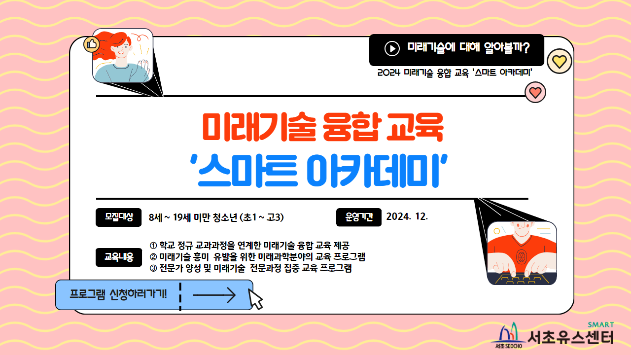 서초유스센터에서는 서초구의 미래인재 양성을 위해 다양한 활동을 제공하고 있습니다.