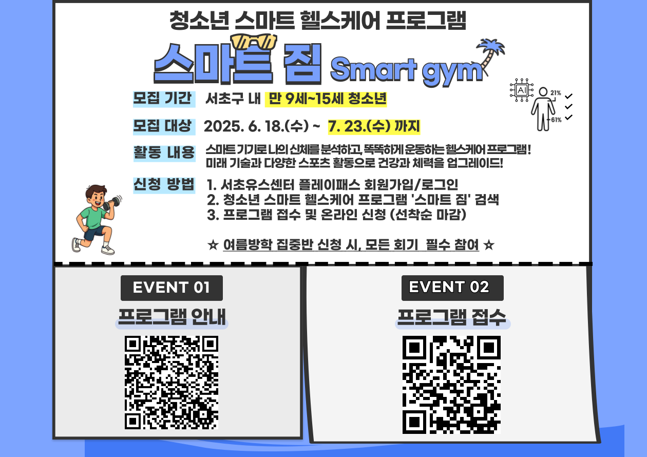 스마트 기기로 나의 신체를 분석하고, 똑똑하게 운동하는 헬스케어 프로그램 ! 미래 기술과 다양한 스포츠 활동으로 건강과 체력을 업그레이드!