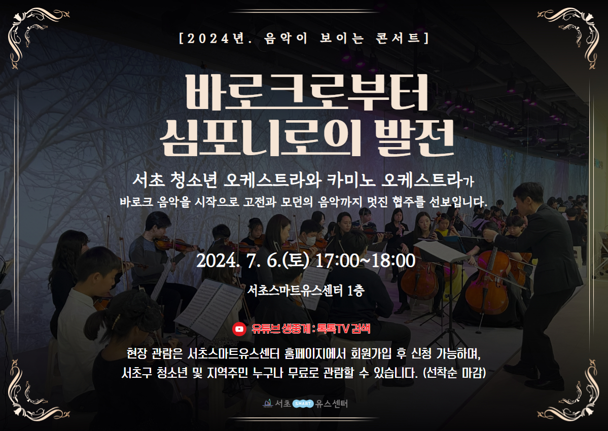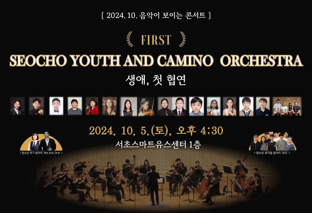 서초 청소년 오케스트라와 카미노 오케스트라가 바로크 음악을 시작으로 고전과 모던의 음악까지 멋진 협주를 선보입니다.