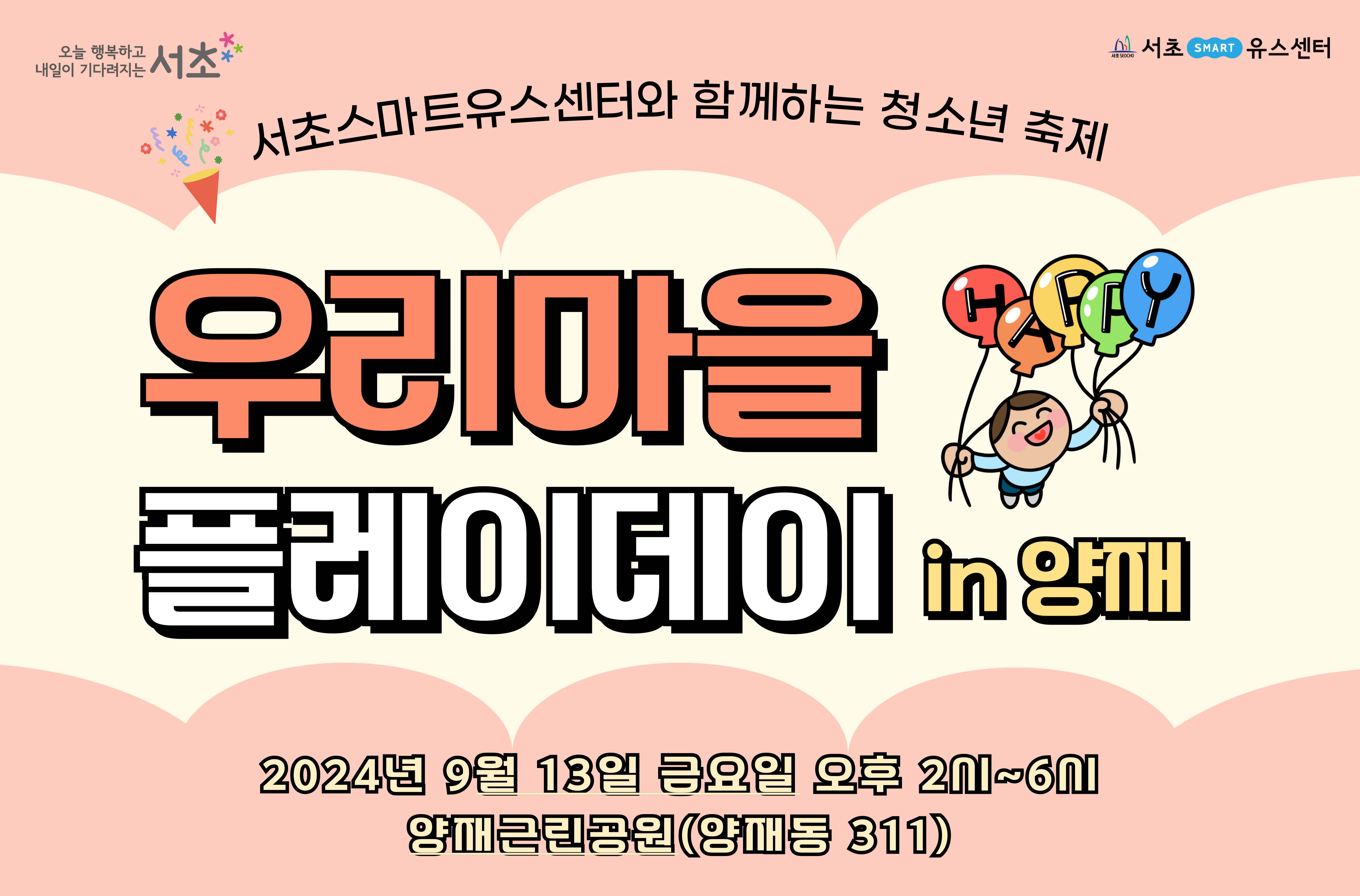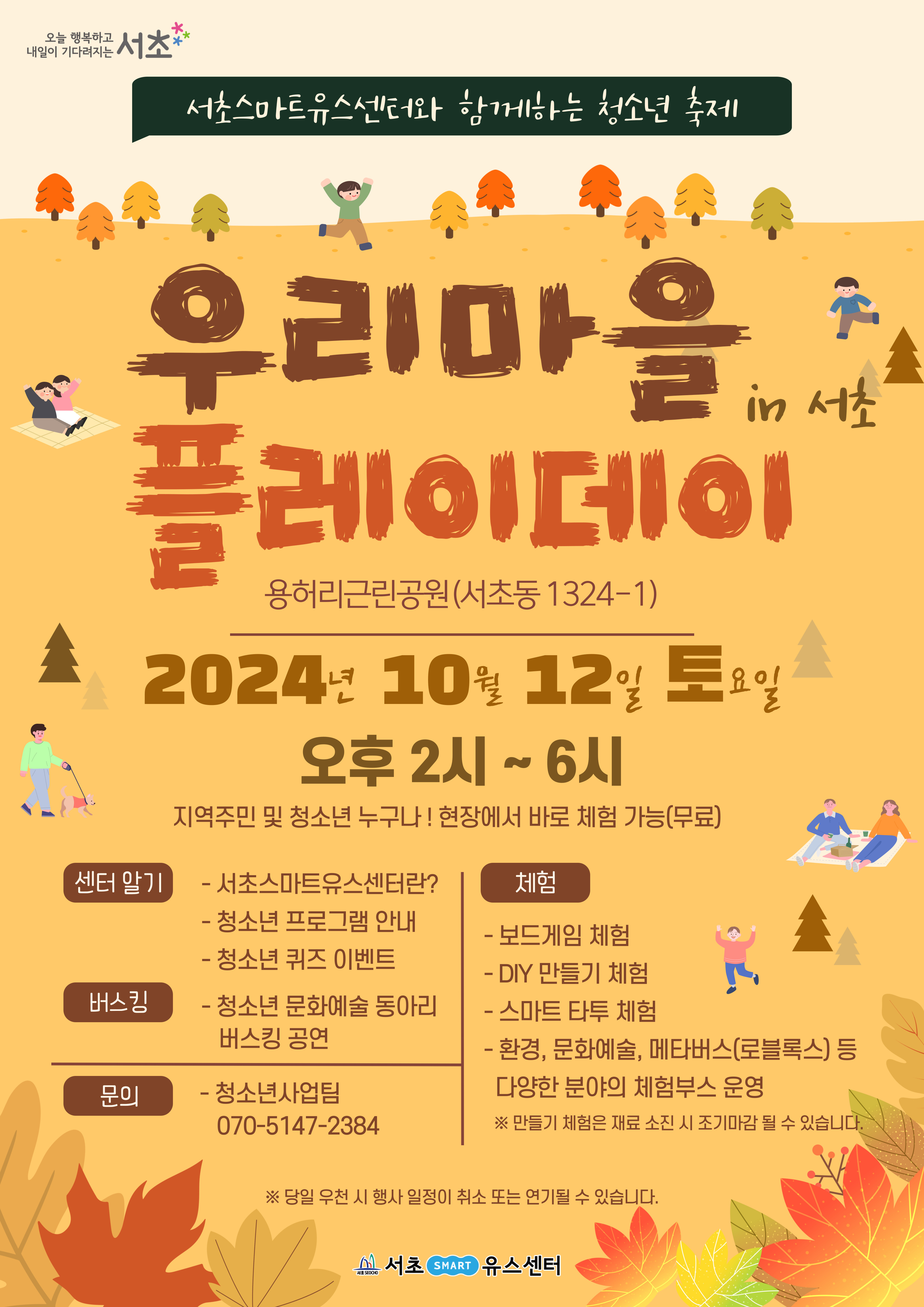 서초스마트유스센터와 함께하는 찾아가는 청소년 축제 - 센터 및 청소년 활동 안내 - 청소년 전용공간 체험 - 다양한 주제의 체험부스 운영 - 청소년 버스킹 공연 및 이벤트
