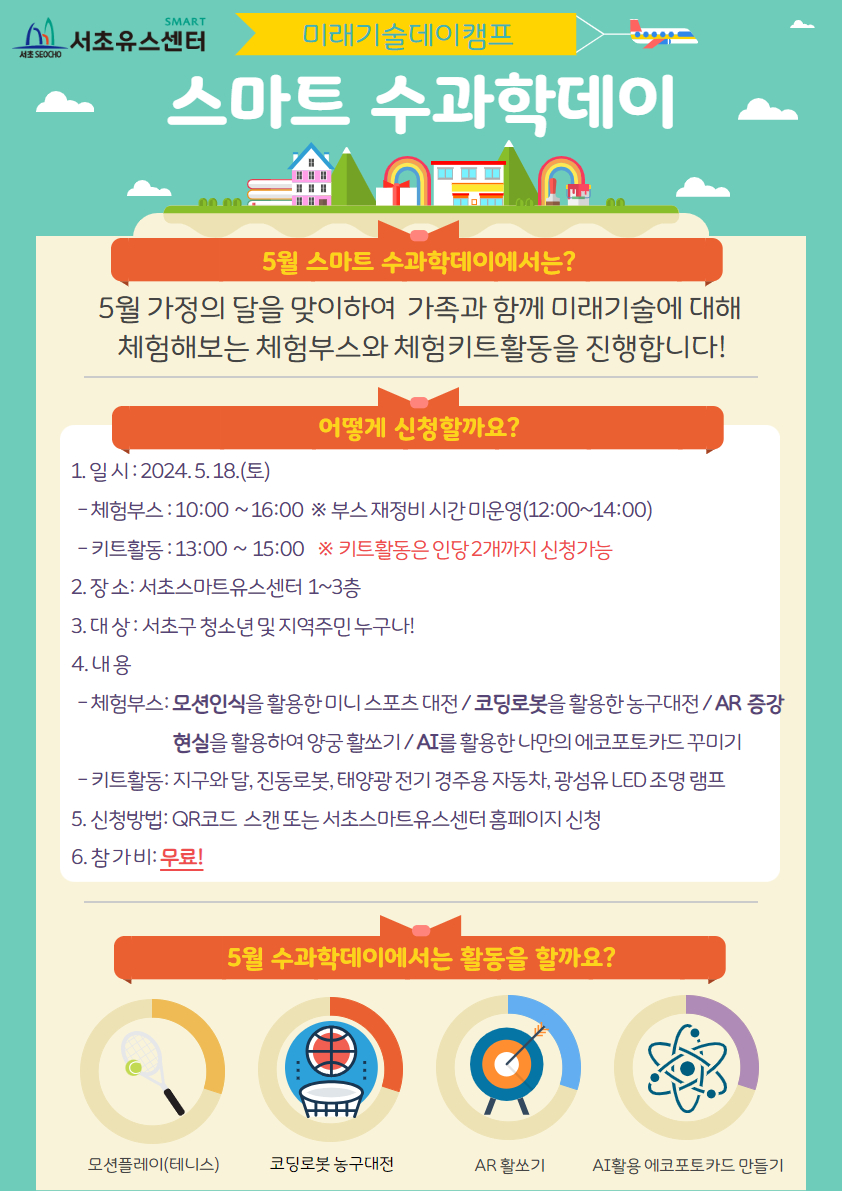 신청은 하단 본문 링크 접속 [미래기술 체험부스] 1층 - 모션인식을 활용한 미니 스포츠 대전 1층 - 코딩로봇을 활용한 슈팅 농구대전 2층 - AR 증강현실을 활용한 양궁 활 쏘기 2층 - AI기술을 활용한 나만의 에코포토카드 꾸미기 [미래기술 키트활동] 3층 - 지구와 달, 진동로봇, 태양광 전기 경주용 자동차, 광섬유 LED 램프 만들기