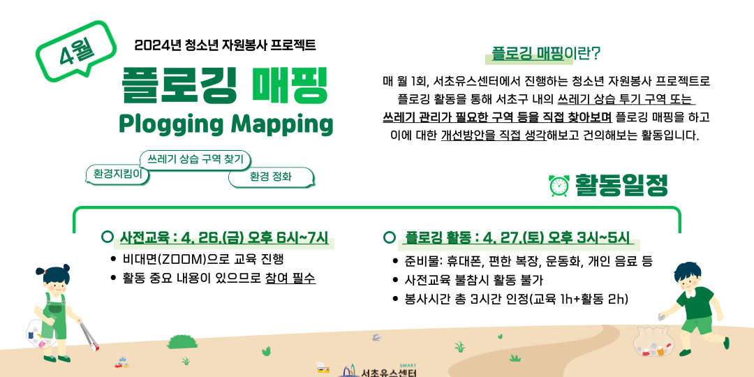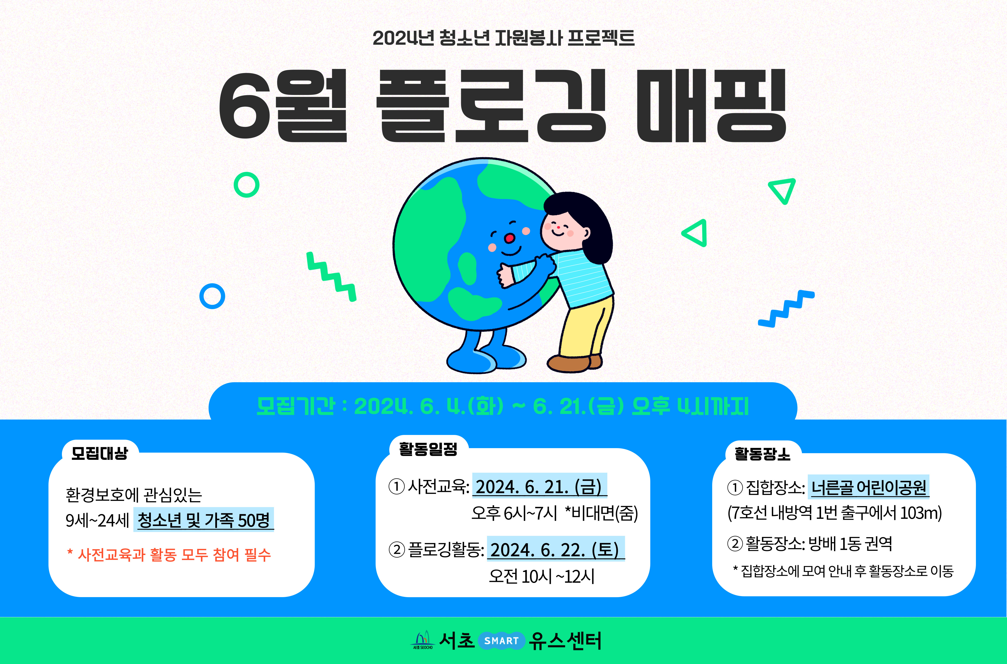 사전교육: 2024. 6. 21.(금) 오후 6시~7시 / 플로깅 활동: 2024. 6. 22.(토) 오전 10시~12시