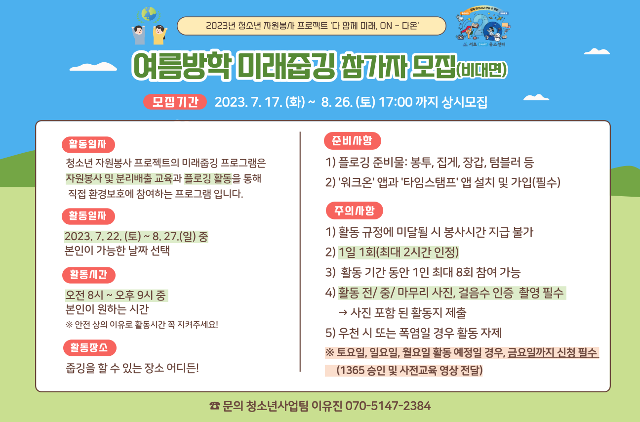 사전교육(비대면): 2023. 8. 25.(금) 18:00~19:00 / 미래줍깅: 2023. 8. 26.(토) 10:00~12:00
