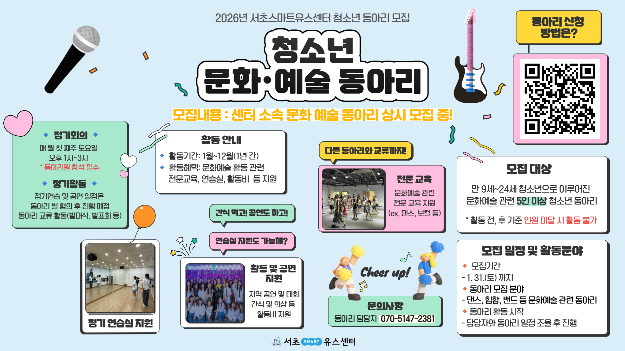 [청소년 문화·예술동아리 활동 지원] 1. 청소년 문화·예술관련 전문교육 및 연계 프로그램 지원 2. 연습실 무료 지원 3. 다양한 형태의 센터 및 외부 공연 연계 지원 4. 동아리 활동비 지원 등