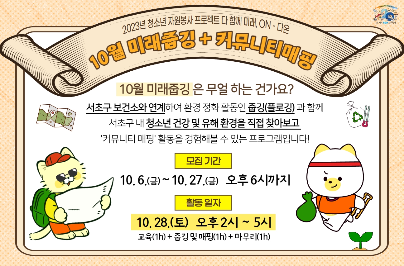 서초구 보건소와 연계하여 환경 정화 활동인 줍깅(플로깅) 과 함께 서초구 내 청소년 건강 및 유해 환경을 직접 찾아보고 '커뮤니티 매핑' 활동을 경험해볼 수 있는 프로그램