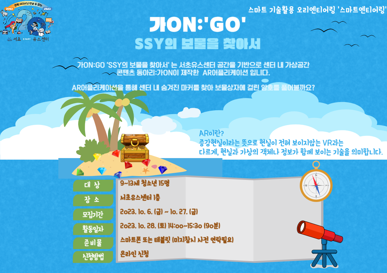 AR어플리케이션 가ON:'GO'를 통해 센터 내 숨겨진 마커를 찾아 힌트를 획득하여 보물상자에 걸린 암호를 풀어보는 미래기술 활용 방탈출 프로그램 입니다.