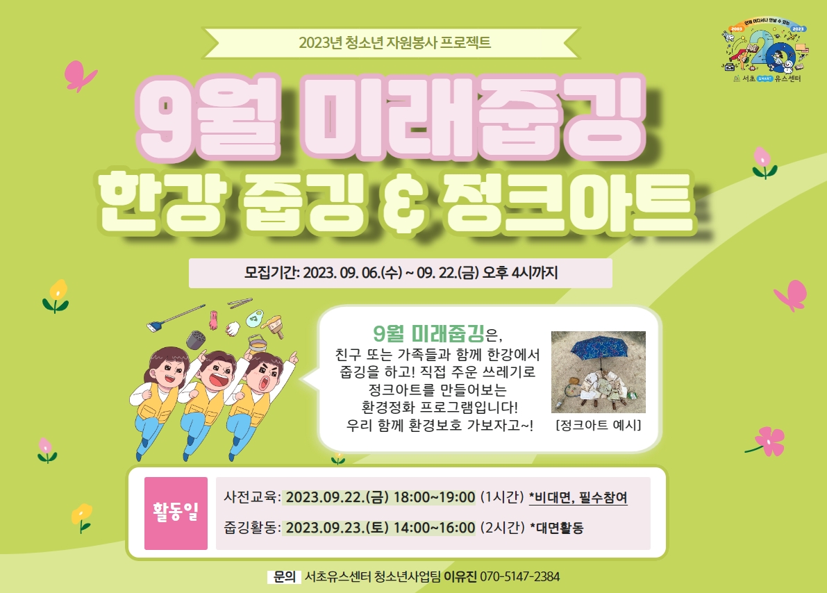 사전교육(비대면): 2023. 9. 22.(금) 18:00~19:00 / 미래줍깅: 2023. 9. 23.(토) 14:00~16:00