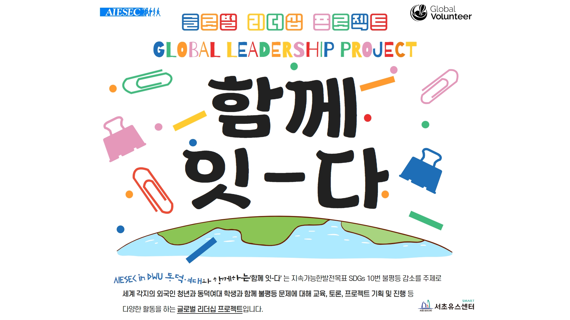 지속가능한발전목표 SDGs 10번 불평등 감소를 주제로 세계 각지의 외국인 청년과 동덕여대 학생과 함께 불평등 문제에 대해 교육, 영어 토론, 프로젝트 기획 및 진행 등 다양한 활동 진행