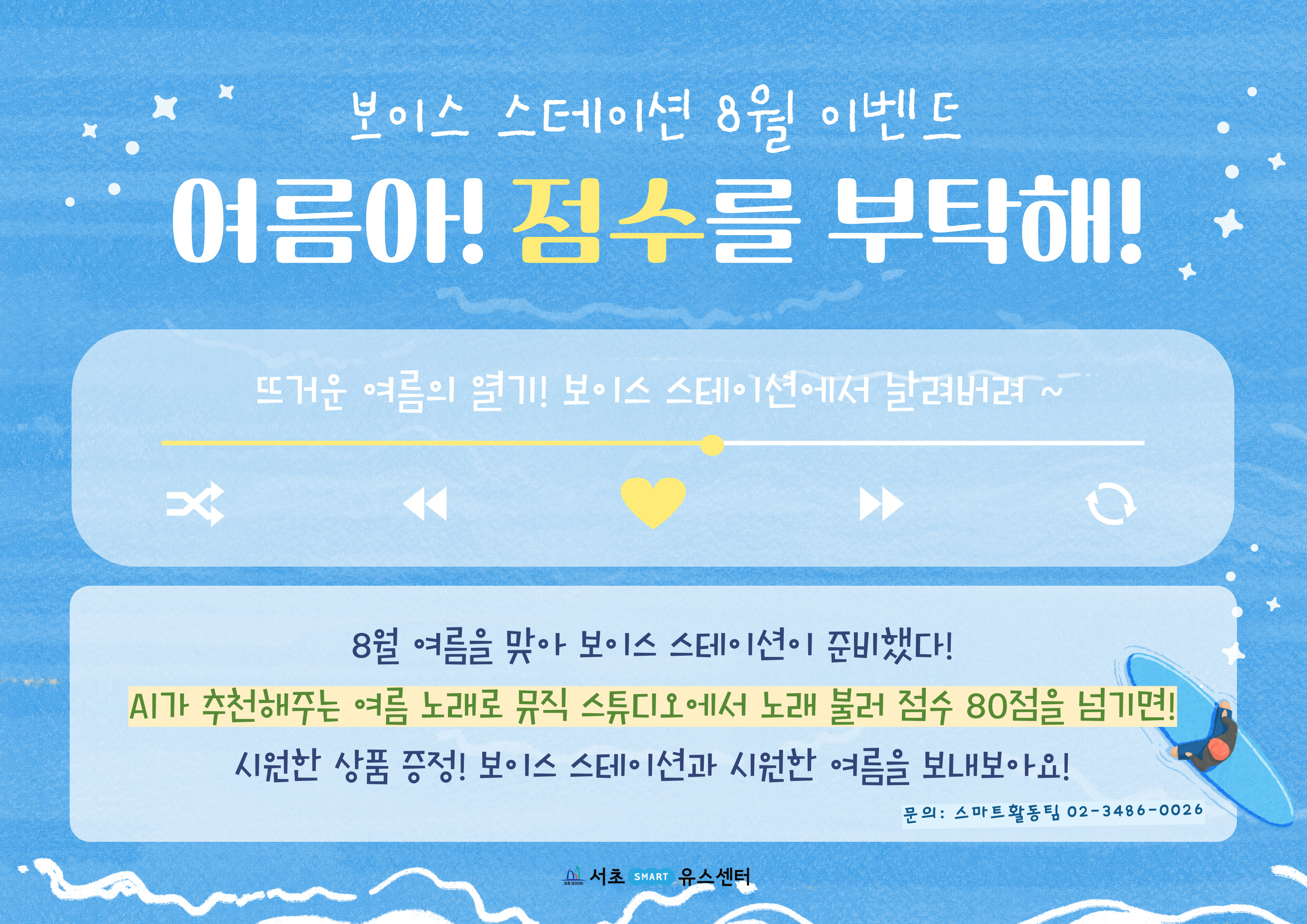 ① AI챗봇에게 [여름] [방학]을 주제로 프롬프트 작성 후 노래 추천받기! ② 추천곡 중 하나를 선택하여 노래방 점수 미션을 수행! ③ ‘보이스 스테이션’ 오픈채팅방에 점수 인증하면 참여 완료-! (추첨 통해 상품 증정)