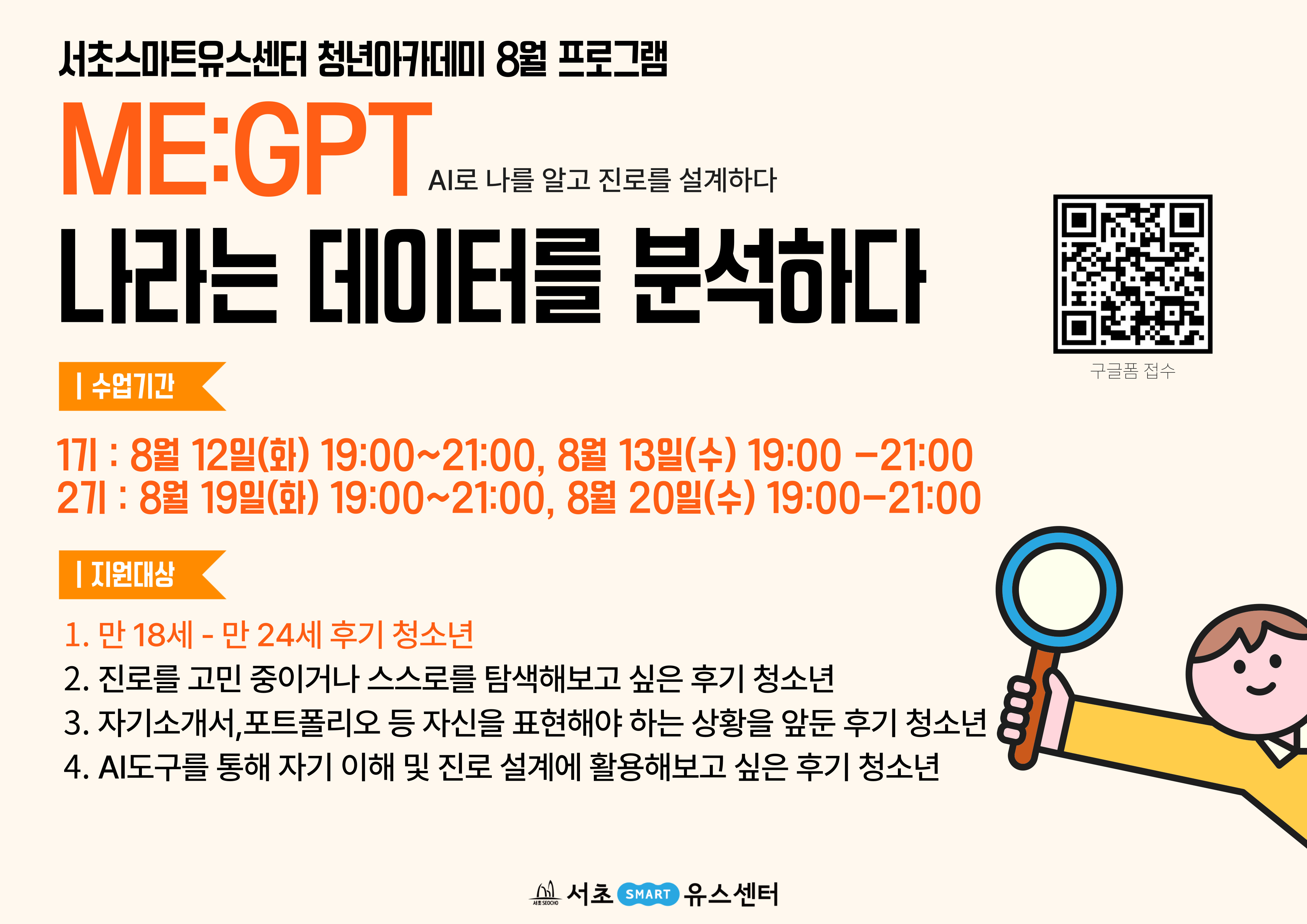 청년아카데미 ME:GPT는 인공지능 챗봇을 활용해 자신을 탐색하고 표현하는 자기이해 워크숍입니다. 프롬프트 실습을 통해 나만의 이야기와 성향을 정리하고 AI와의 대화를 통해 새로운 시각을 얻습니다. 진로 설계 전 '나'를 이해하는 데 중점을 둔 후기 청소년 맞춤형 프로그램입니다.