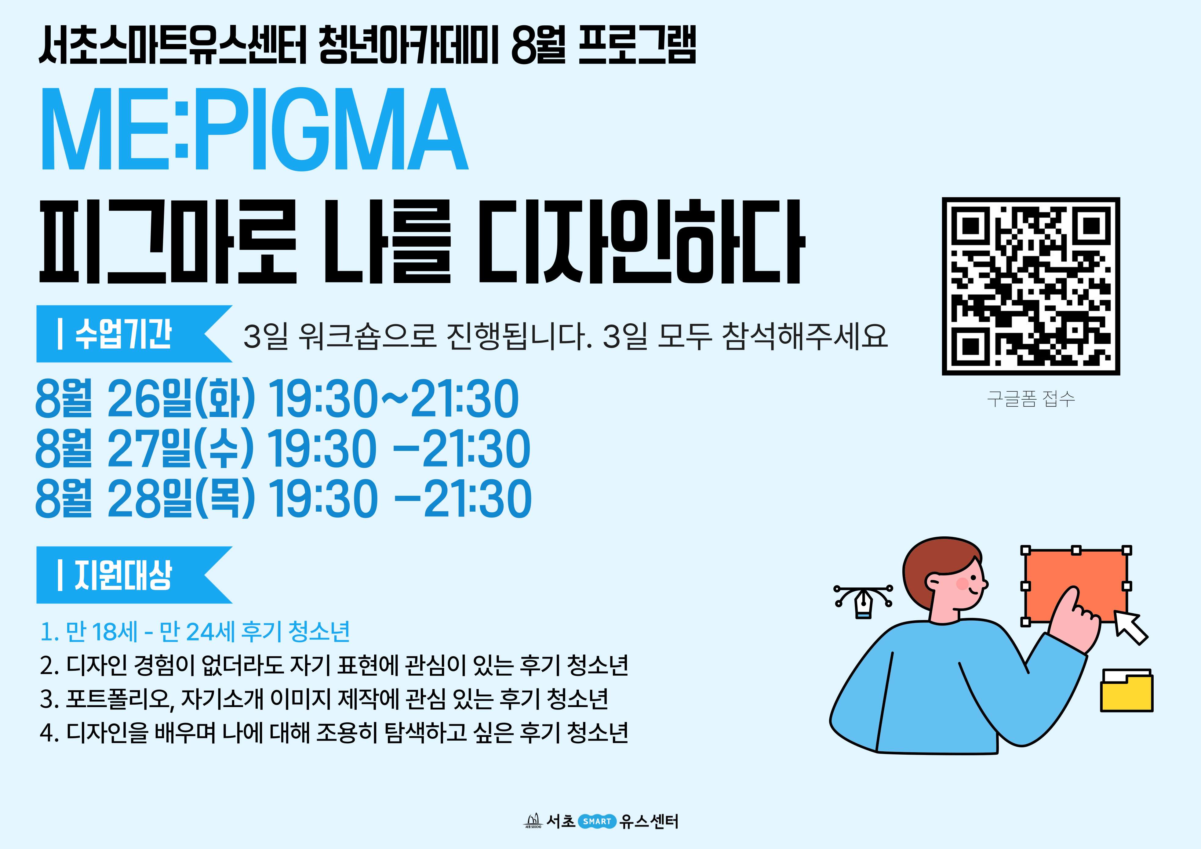 청년아카데미 ME:PIGMA는 디자인 툴 ‘피그마(Figma)’를 활용해 나만의 시각 콘텐츠를 제작하는 프로그램입니다. 색상, 키워드, 레이아웃 등을 통해 자신의 성격·취향을 감각적으로 표현하는 방법을 배웁니다. 실습 중심의 수업을 통해 자기 이해와 표현 역량을 키우고 미니 포트폴리오 제작까지 경험할 수 있습니다.