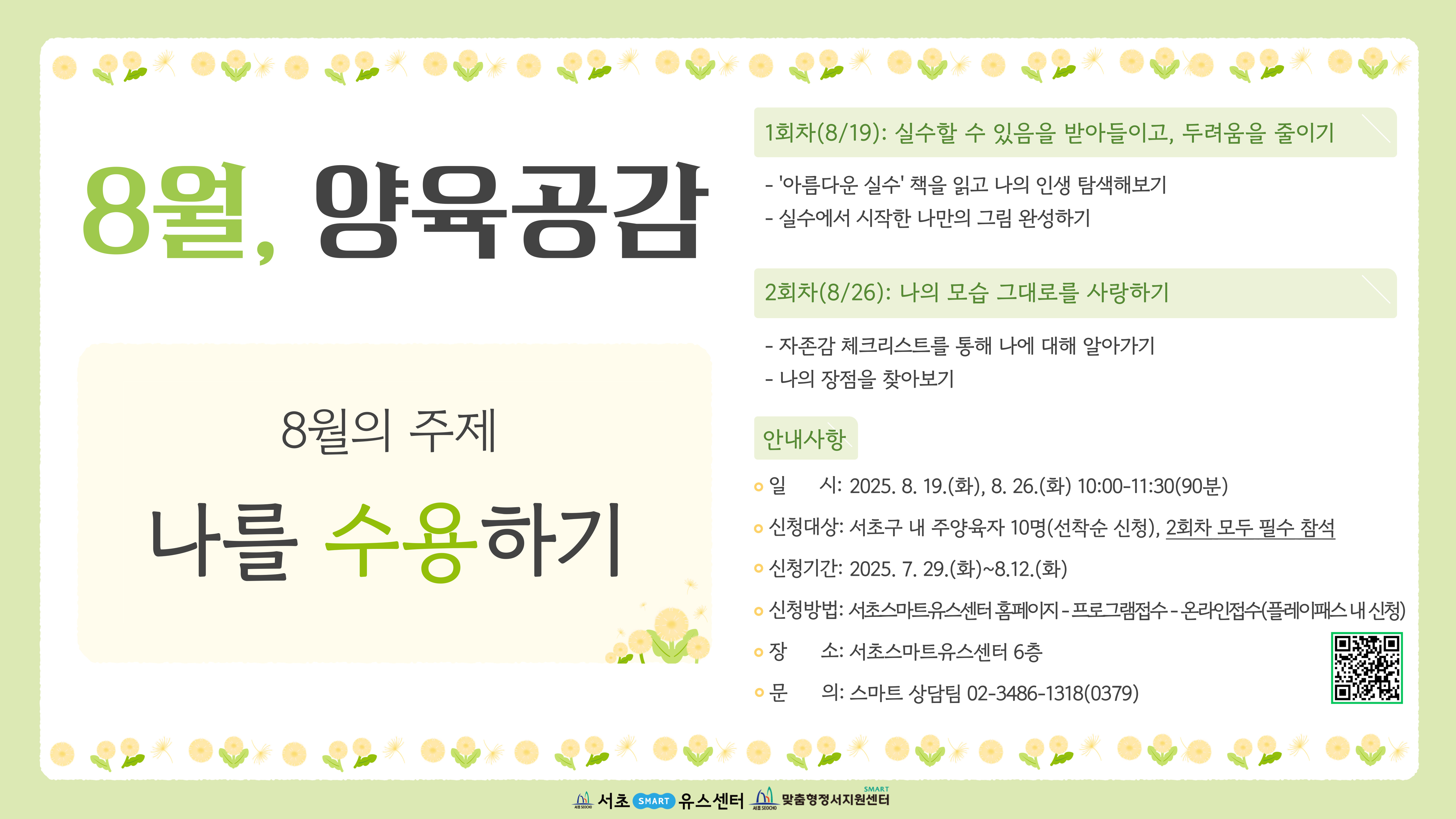 서초구 내 주양육자 대상 미니 부모특강 진행, 자기돌봄 및 자기이해 특강 * 1회차(8/19): 실수할 수 있음을 받아들이고, 두려움을 줄이기 - '아름다운 실수' 책을 읽고 나의 인생 탐색해보기 - 실수에서 시작한 나만의 그림 완성하기 * 2회차(8/26): 나의 모습 그대로를 사랑하기 - 자존감 체크리스트를 통해 나에 대해 알아가기 - 나의 장점을 찾아보기 ★총 2회차 필수 참석★