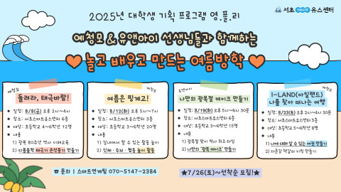 서초유스센터에서는 서초구의 미래인재 양성을 위해 다양한 활동을 제공하고 있습니다.