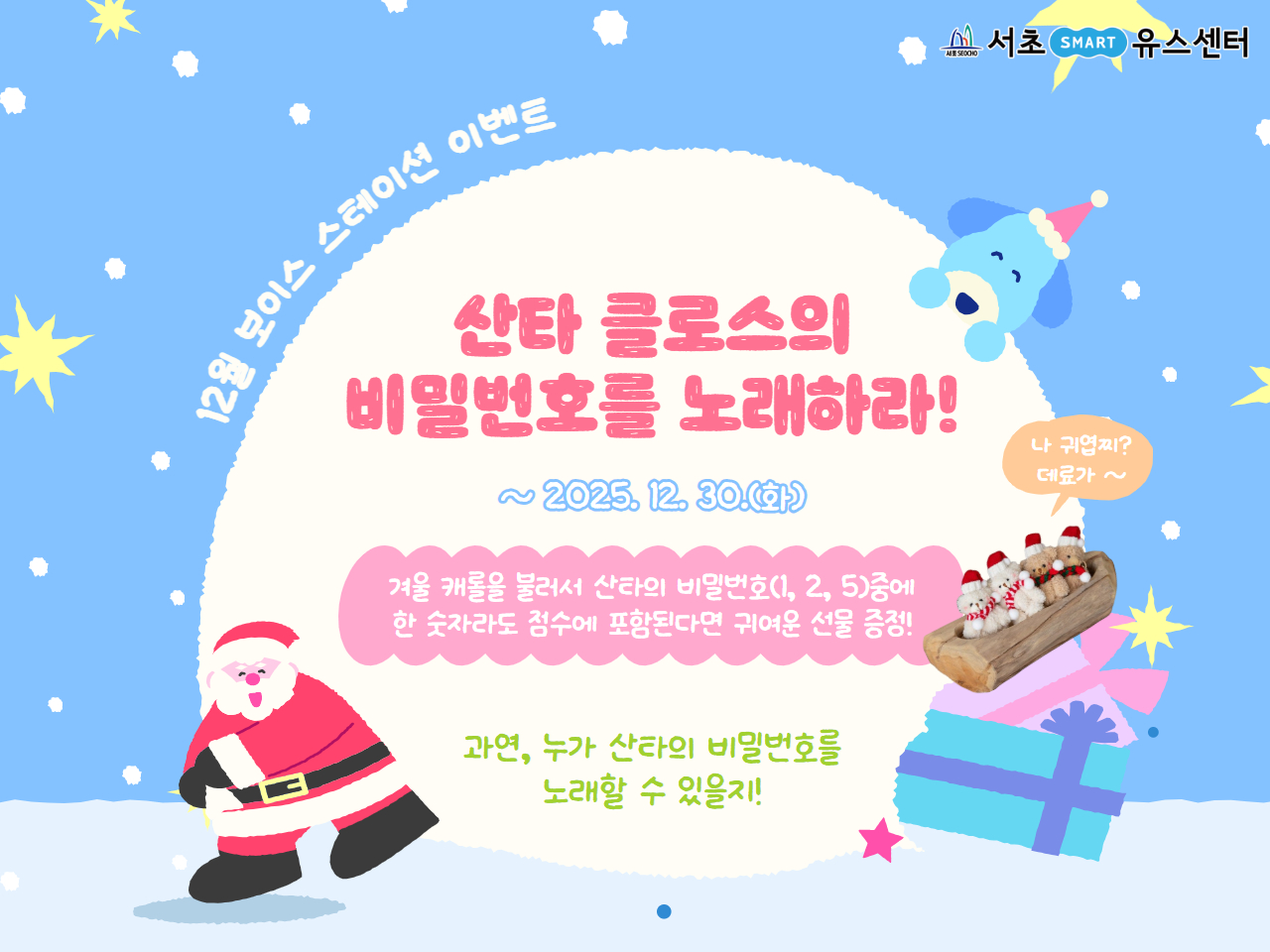 - 캐롤을 불러 점수가 산타의 비밀번호(1, 2, 5) 중 한 자리라도 포함되면 인형키링 증정