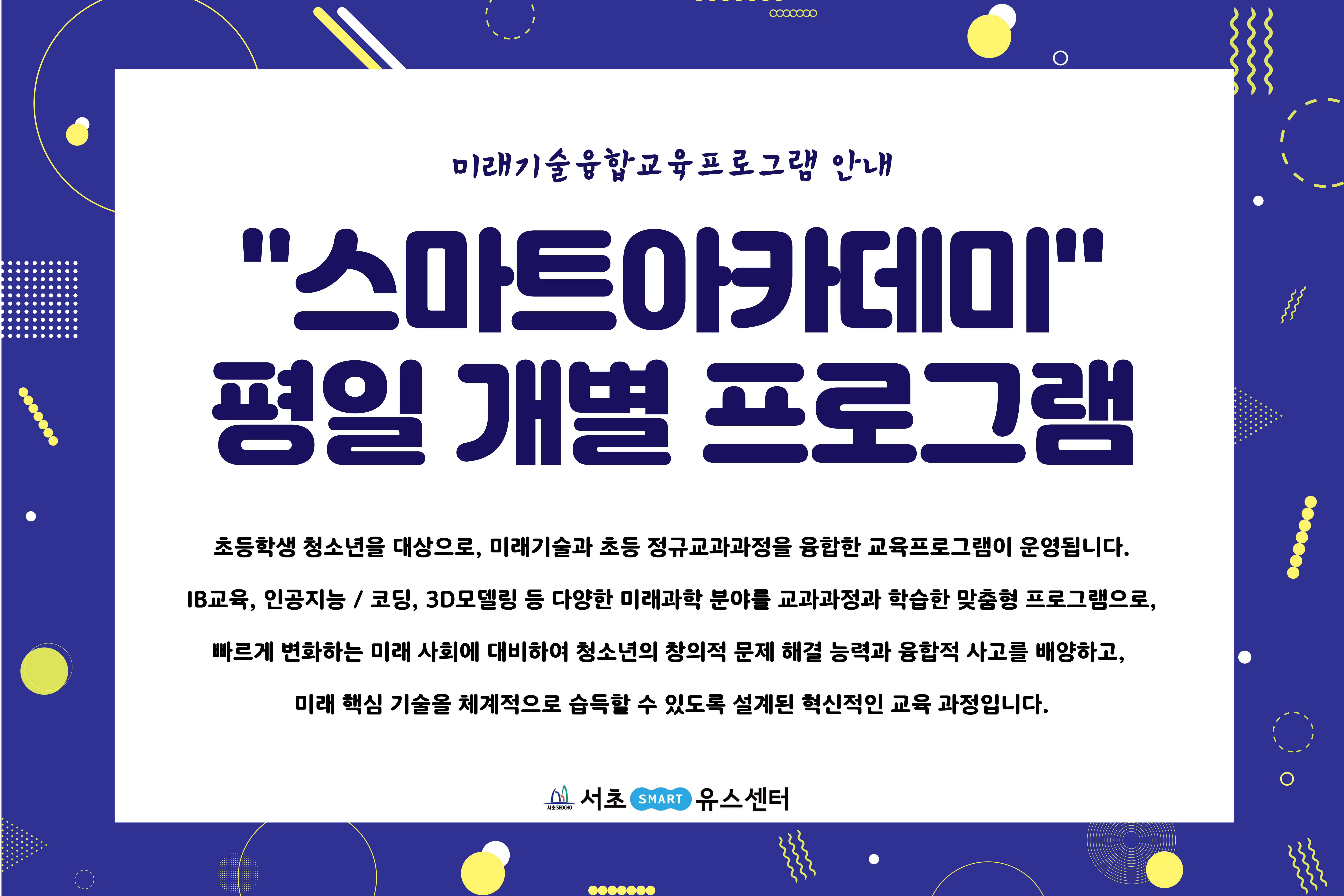 4차 산업시대를 대비한 인공지능/코딩 교육, IB교육, 3D모델링 교육 등 미래 기술과 과학 분야를 교과 과정과 융합한 평일 강좌형 교육 프로그램