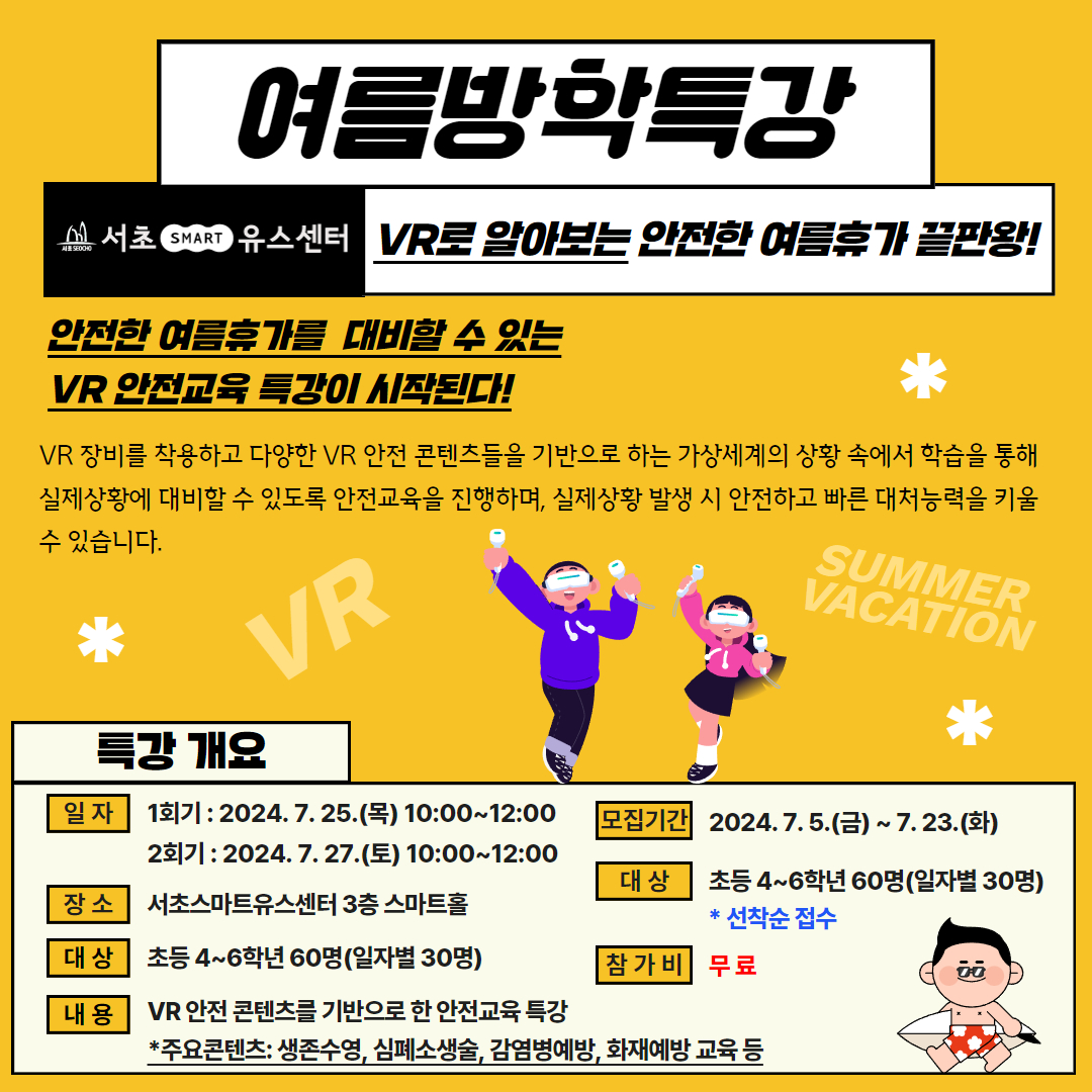 여름방학을 맞이하여 VR안전교육 콘텐츠(생존수영, 심폐소생술, 감염병 예방 등)를 기반으로 한 안전교육을 제공함으로써, 청소년들이 안전한 여름휴가를 보낼 수 있도록 하고자 합니다.